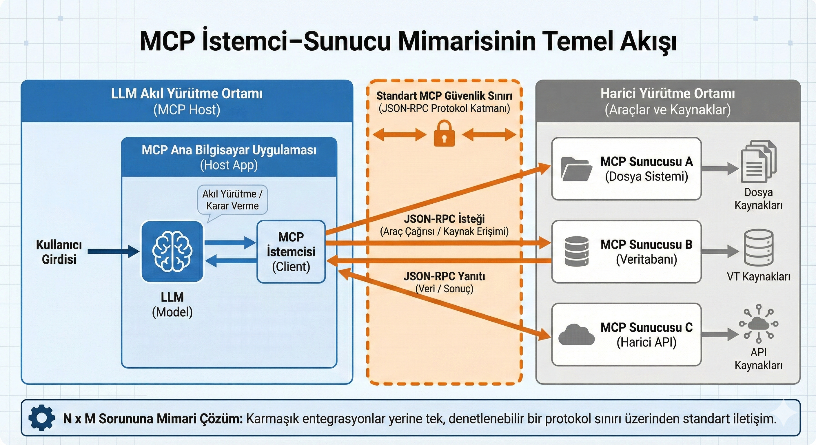 MCP'nin temel akışı, bir istemci (genellikle LLM'in kendisi veya bir ajan) ile bir MCP sunucusu (aracı barındıran) arasında gerçekleşir. Bu süreç birkaç basit adımdan oluşur: