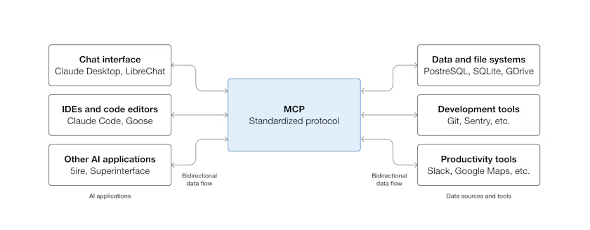 protocol.png — MCP’nin IDE’ler, chat arayüzleri ve veri kaynakları arasında iki yönlü veri akışını özetler.Demo video (YouTube)